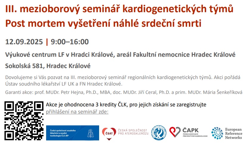 Dne 12. září 2025 se ve Výukovém centru LF ve FN Hradec Králové uskutečnil III. MEZIOBOROVÝ SEMINÁŘ KARDIOGENETICKÝCH TÝMŮ včetně POST MORTEM VYŠETŘENÍ NÁHLÉ SRDEČNÍ SMRTI, který pořádal Ústav soudního lékařství LF UK a FN Hradec Králové ve spolupráci s I. kardioangiologickou klinikou FN HK a Oddělením lékařské genetiky FN HK, za podpory České kardiologické společnosti. Celodenního sympozia se zúčastnilo více než 60 odborníků napříč obory soudní lékařství, kardiologie, lékařská genetika, kardiogenetika, vnitřní lékařství, patologie, a dalších, kteří na místě vyslechli tematické přednášky 13 odborníků z Česka a Slovenska týkající se post mortem vyšetřování případů náhlé srdeční smrti s podezřením na geneticky vázané onemocnění, vč. následné komplexní diagnostické a preventivní péče o přímé příbuzné těchto zemřelých. Dalších více než 40 odborníků bylo připojeno distančně online v rámci celodenního virtuálního přenosu z konference. Odborná sdělení byla spojena s četnými diskusními příspěvky z auditoria, které pokračovaly v závěrečném diskuzním panelu, při kterém proběhla rozděleně samostatná zasedání jednotlivých stěžejních odborností, tj. soudních lékařů, kardiologů a genetiků tzv. "u kulatého stolu", který poskytl prostor k tematizování, diskuzi i řešení dílčích problémů těchto jednotlivých skupin odborníků, které se na komplexním vyšetřování případů náhlé srdeční smrti podílejí.